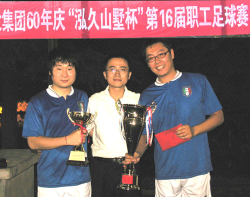 25日17時(shí),季軍爭(zhēng)奪戰(zhàn)在四分公司和六分公司之間展開,海川集團(tuán)吳鑫董事長也親臨比賽現(xiàn)場(chǎng)為隊(duì)員們加油助威。在經(jīng)過50分鐘的激烈爭(zhēng)奪后,由于雙方都過于重視防守,比賽以0:0的比分戰(zhàn)平進(jìn)入點(diǎn)球賽,半決賽失手點(diǎn)球戰(zhàn)的六分公司隊(duì),這次顯示出了較好的腳法,以3:0戰(zhàn)勝四分公司隊(duì)獲得季軍。晚上18時(shí)許,總部足球隊(duì)與二分公司隊(duì)之間的決賽正式開始,比賽中雙方顯示出昂揚(yáng)的斗志,積極拼搶,嚴(yán)密防守,上半場(chǎng)雙方戰(zhàn)成平手,在下半場(chǎng)比賽中,趁著對(duì)手體力下降之機(jī),總部足球隊(duì)的李寧和尹熙文各抓住一次機(jī)會(huì)破門,最終以2:0獲得冠軍。